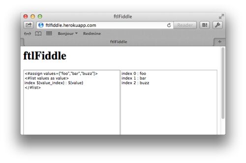 よくあるプレビュー機能付きのMarkdownエディタみたいなノリのものが欲しいなーと思って作ってみました。デモはこちら。 http://ftlfiddle.herokuapp.com 普段使わないbuilt-inを検証したいときなど、作っているアプリのテンプレートにデバッグコードを書き…